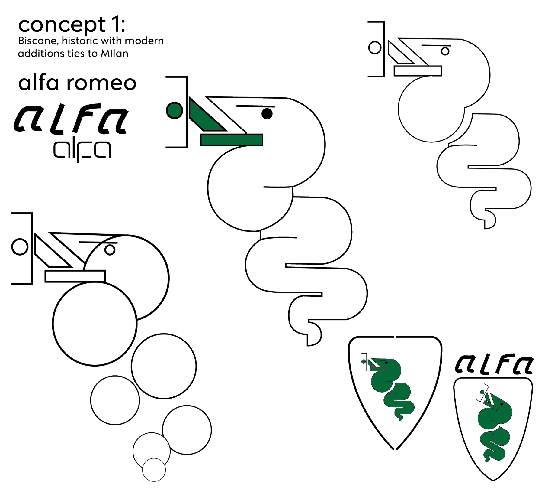 Alfa Romeo is an Italian sports car company with over a century of racing heritage. Re-imagining their logo starts in Milan with a “man eating serpent,” a perfectly aggressive symbol for such a competitive brand. Carrying serpent elements into extensions creates a cohesive brand.